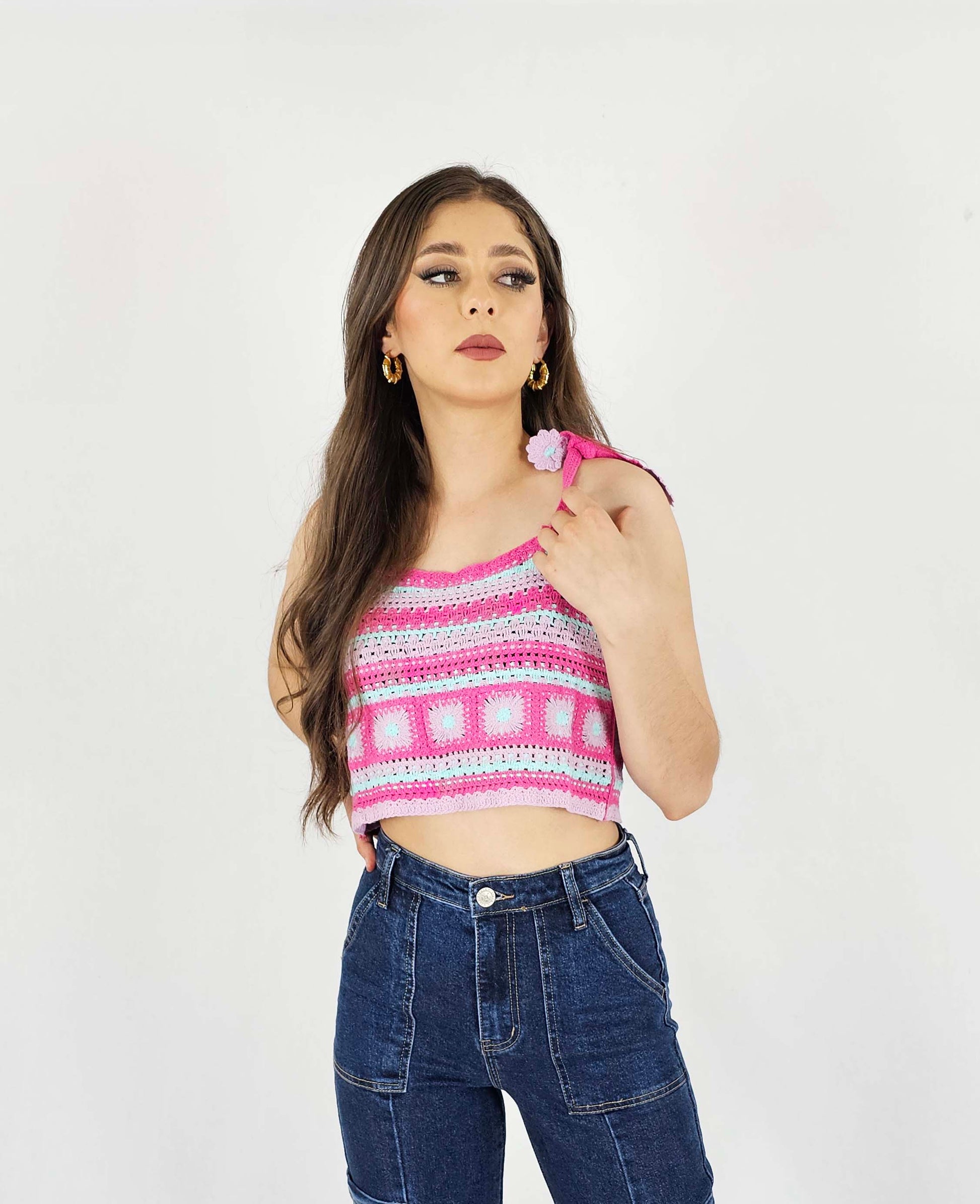 Blusa corta entretejida combinada con flores, 65% algodón 35%poliester, con tirantes.