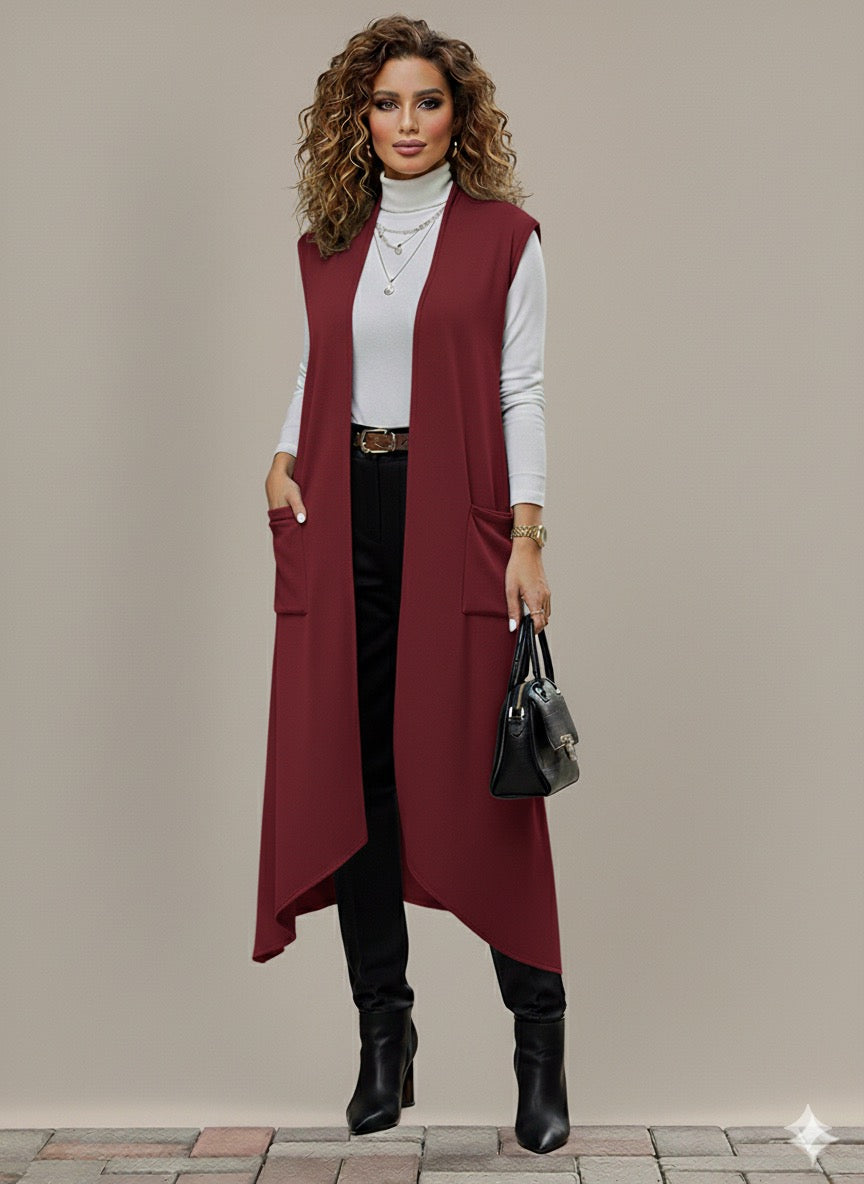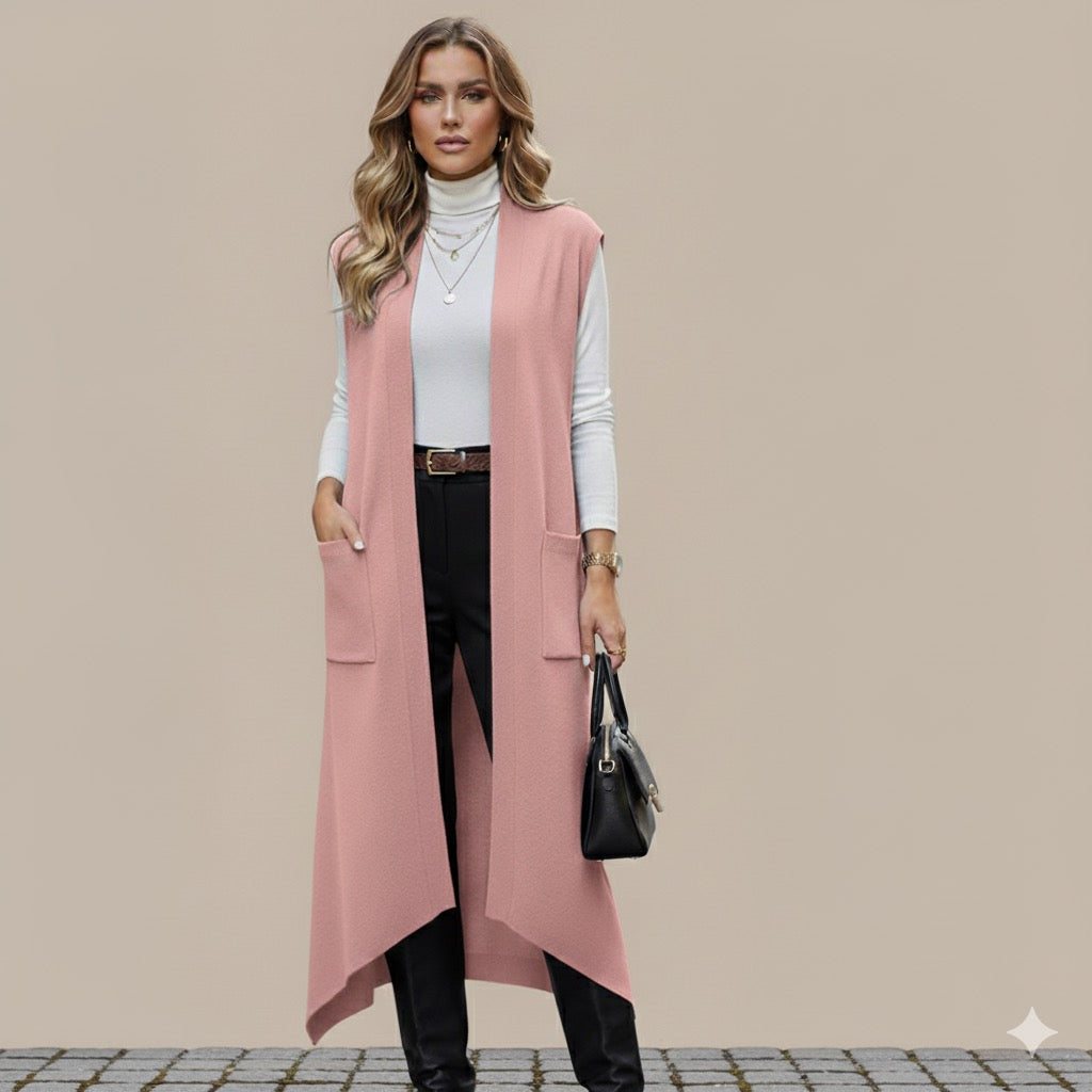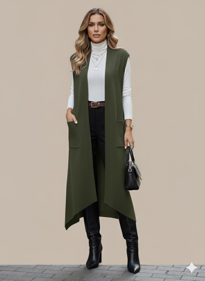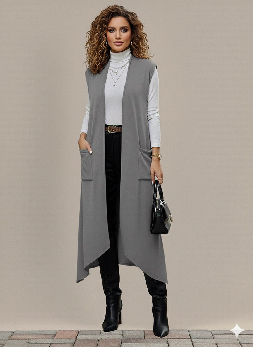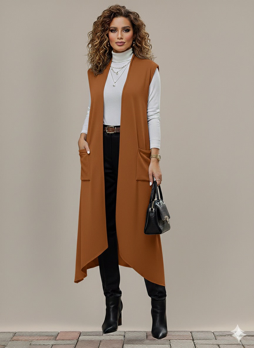 Eleva tu look con este chaleco largo de tejido suave y ligero. Su diseño abierto al frente y sin mangas lo convierte en una prenda versátil que puedes combinar con blusas, vestidos o conjuntos casuales. Los bolsillos frontales aportan practicidad y estilo, ideal para crear capas y darle un toque moderno a cualquier outfit.