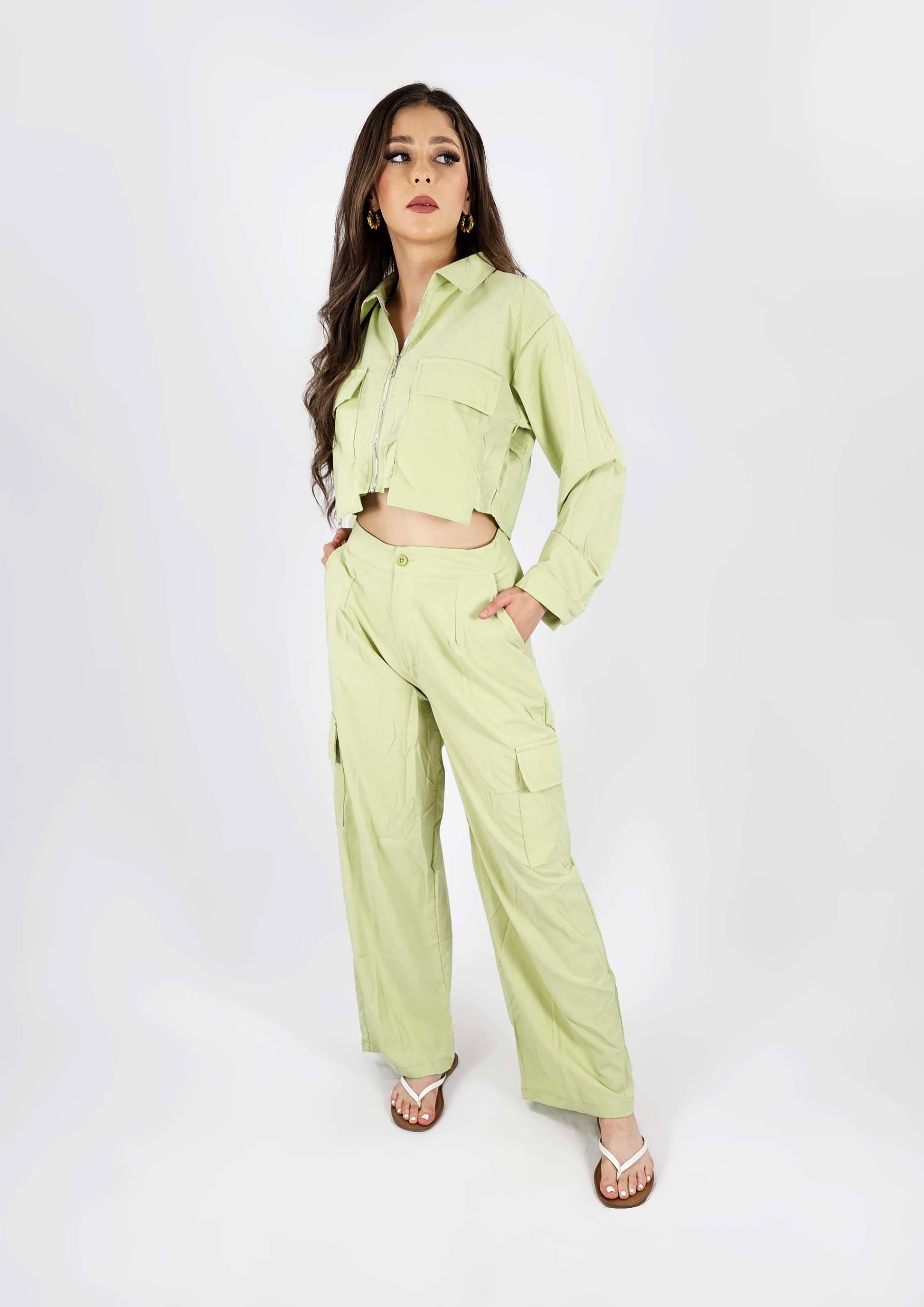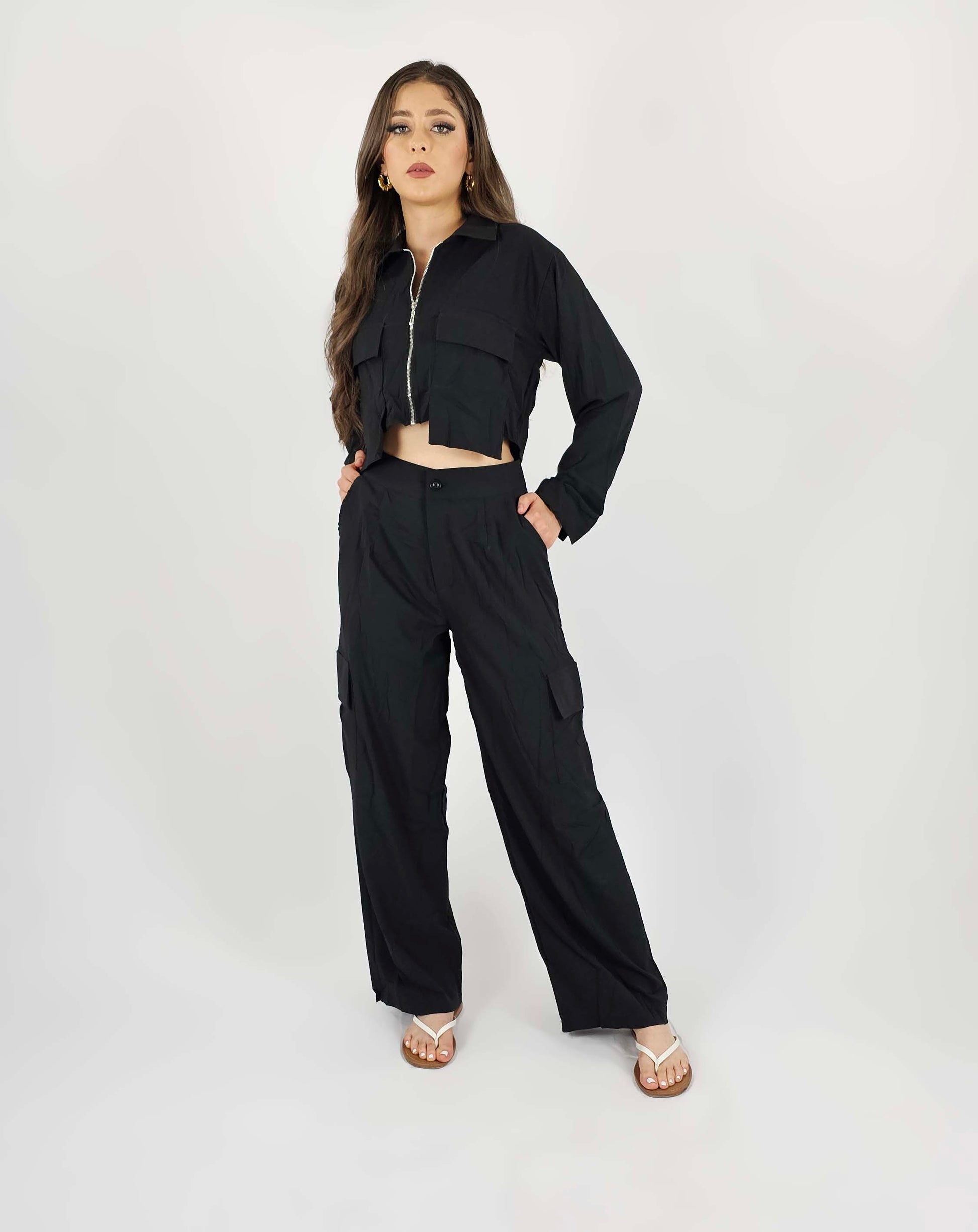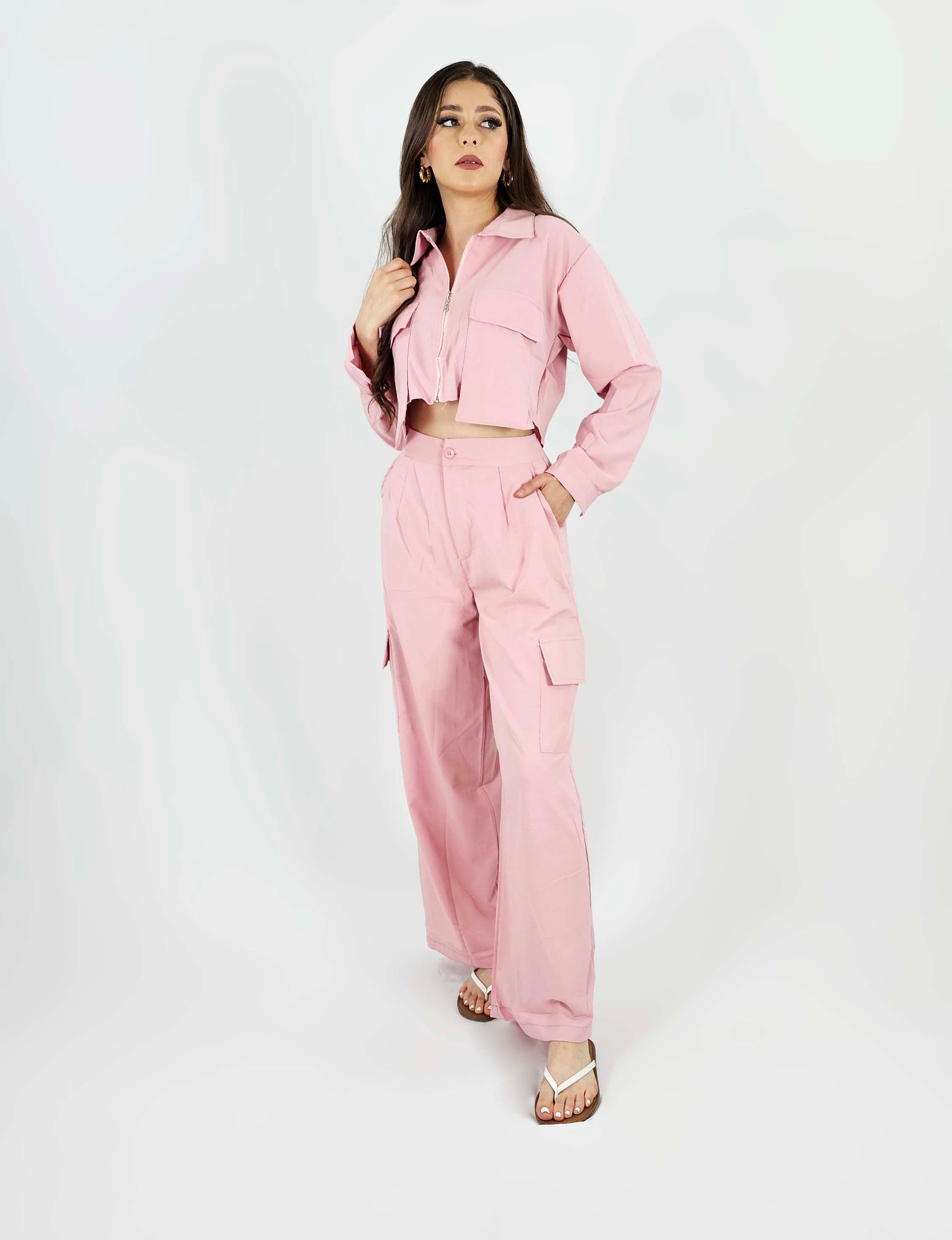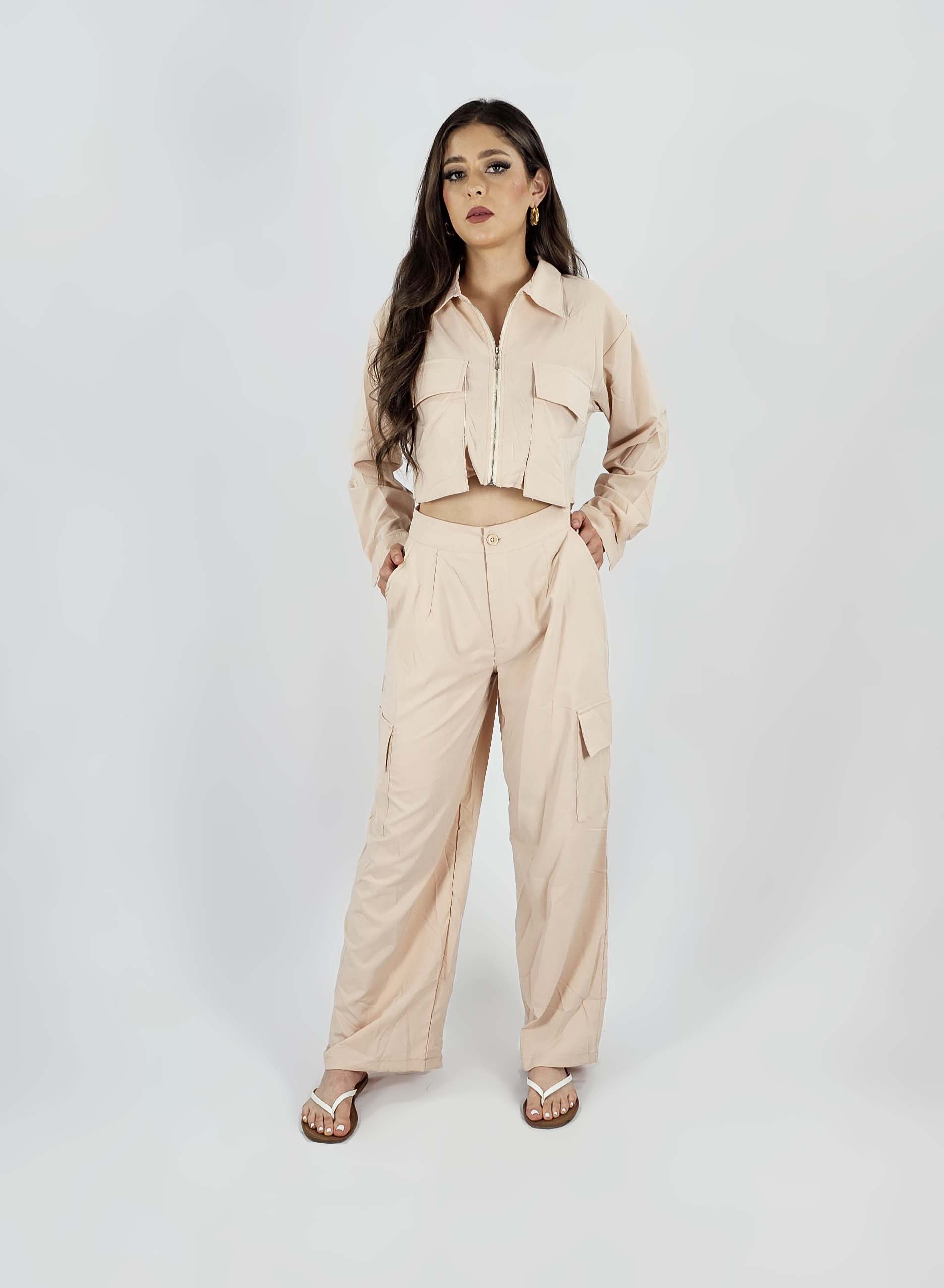 Conjunta de 2 piezas pantalón y camisa corta hecho de 100% poliéster con cierre metálico.