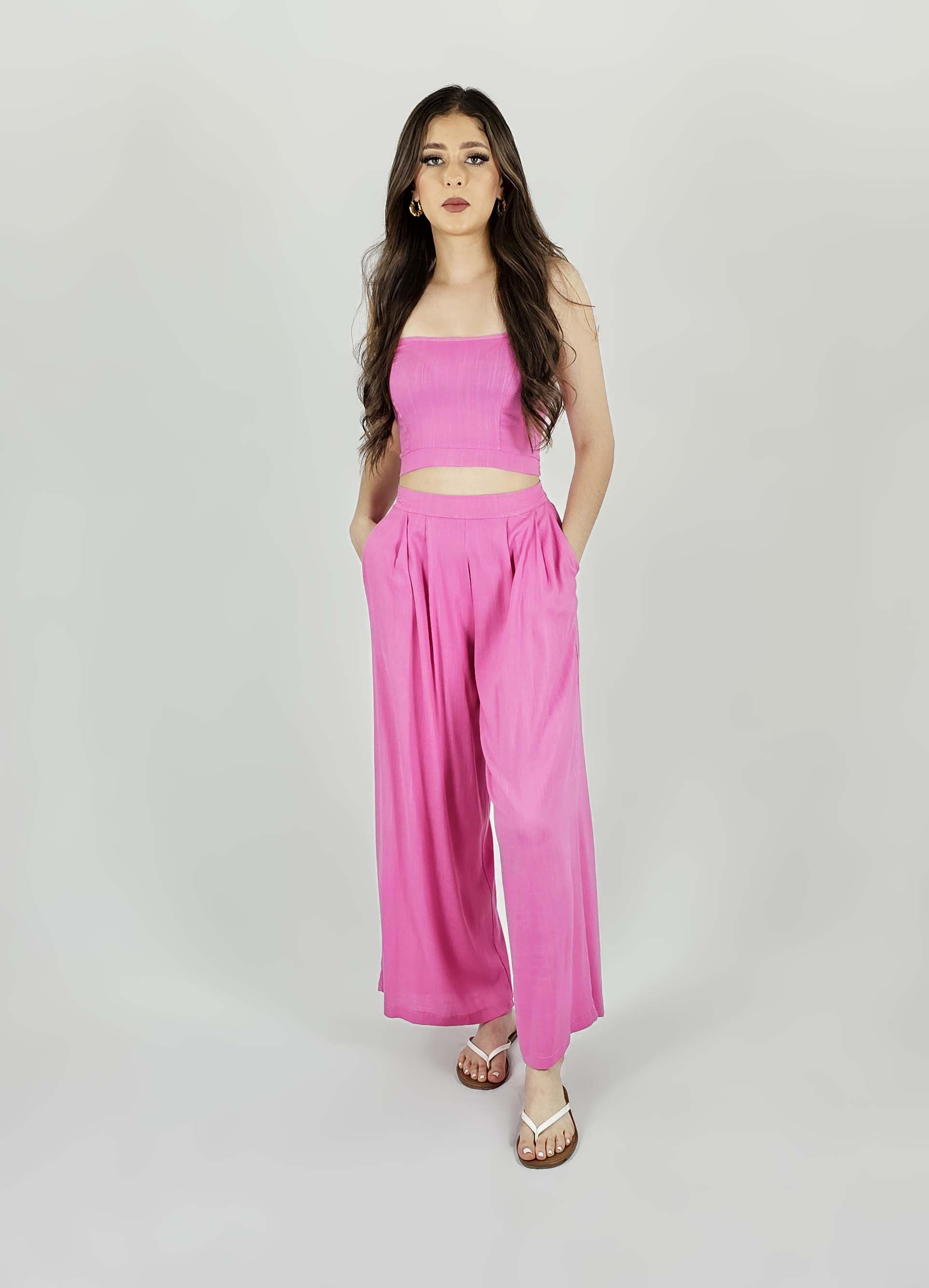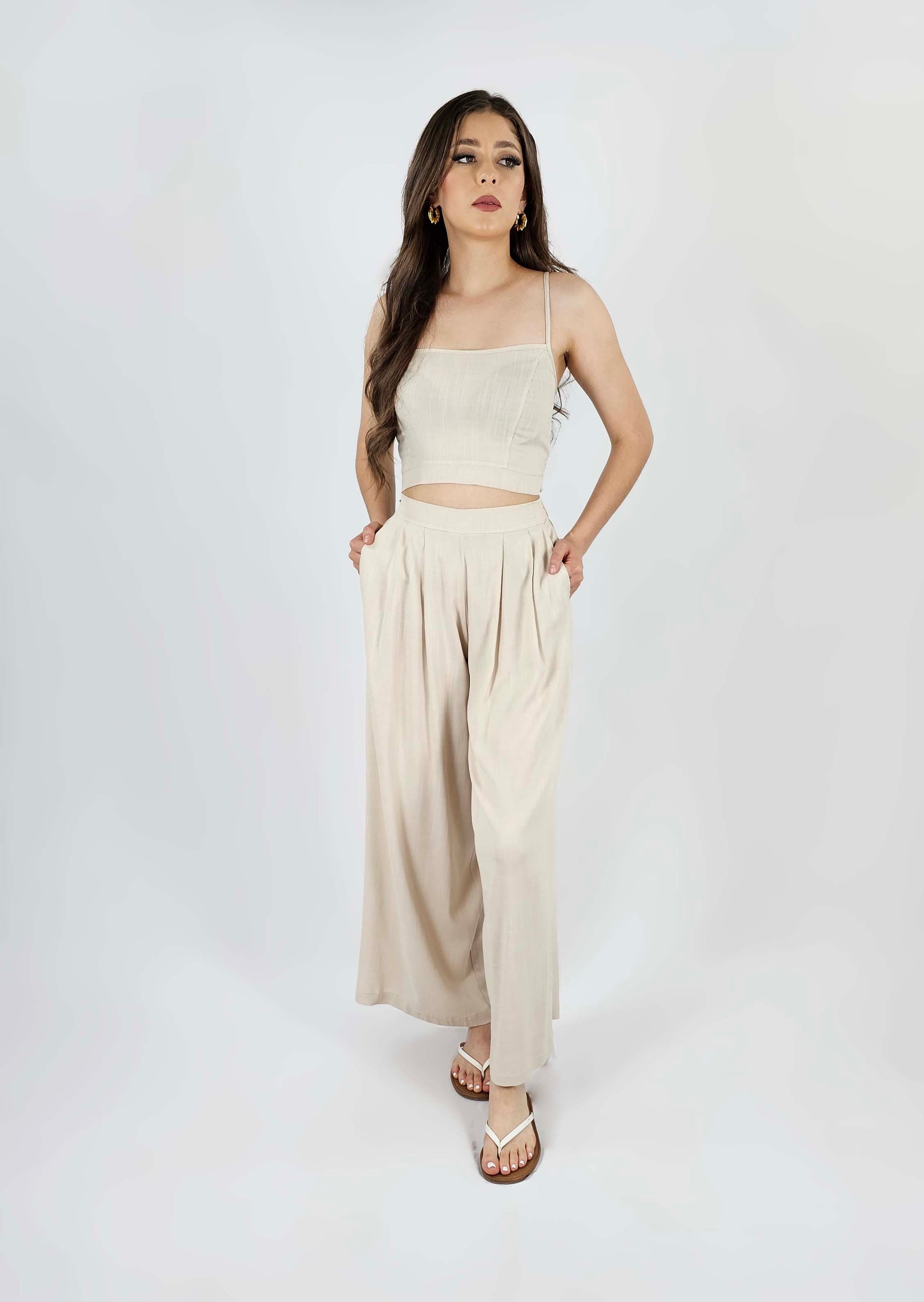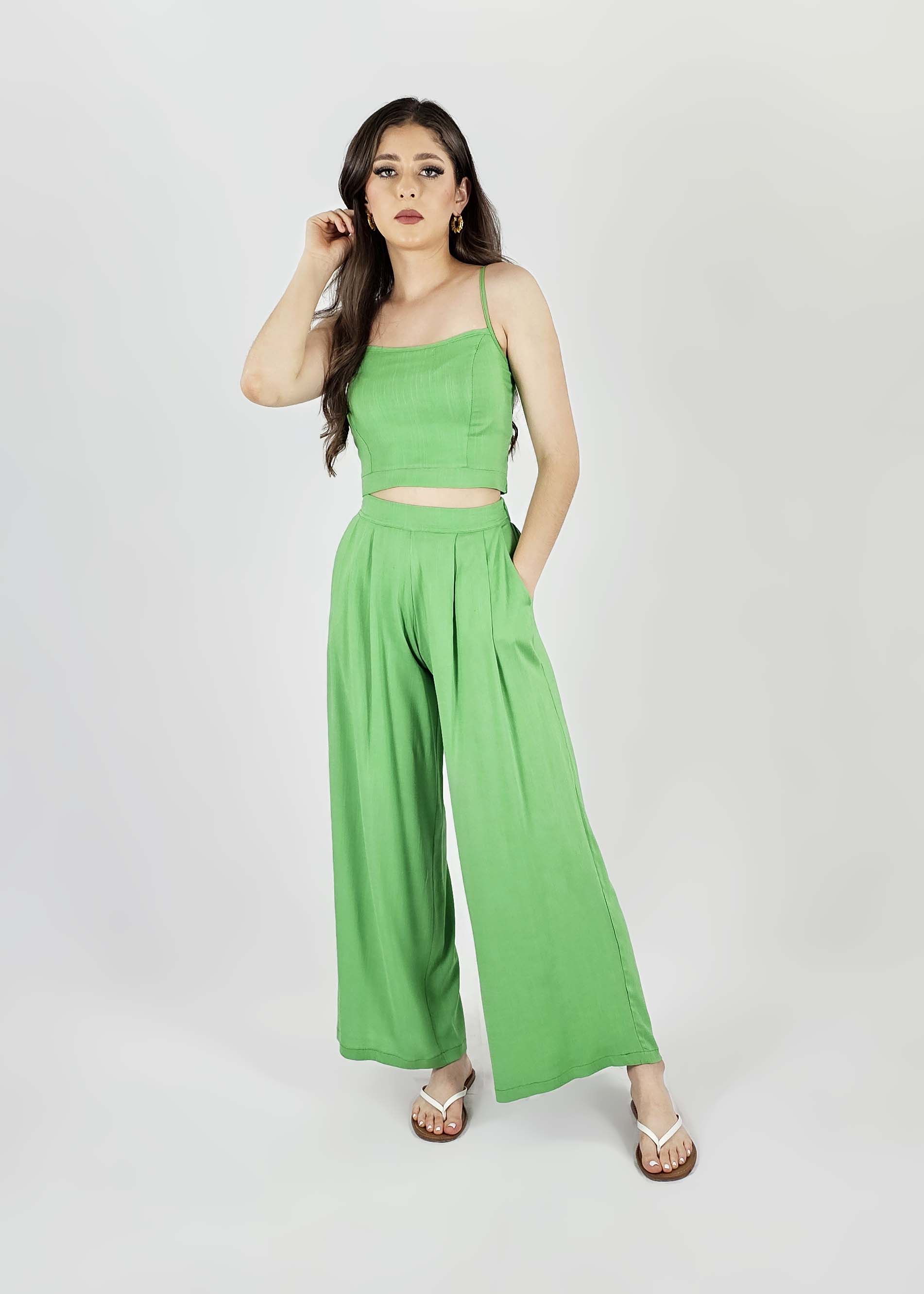 Este conjunto de top y pantalón es fresco y cómodo para cualquier ocasión. Confeccionado en tela ligera, te mantendrá fresco y elegante todo el día. Disfruta de este conjunto versátil que te mantendrá cómodo sin sacrificar tu estilo.