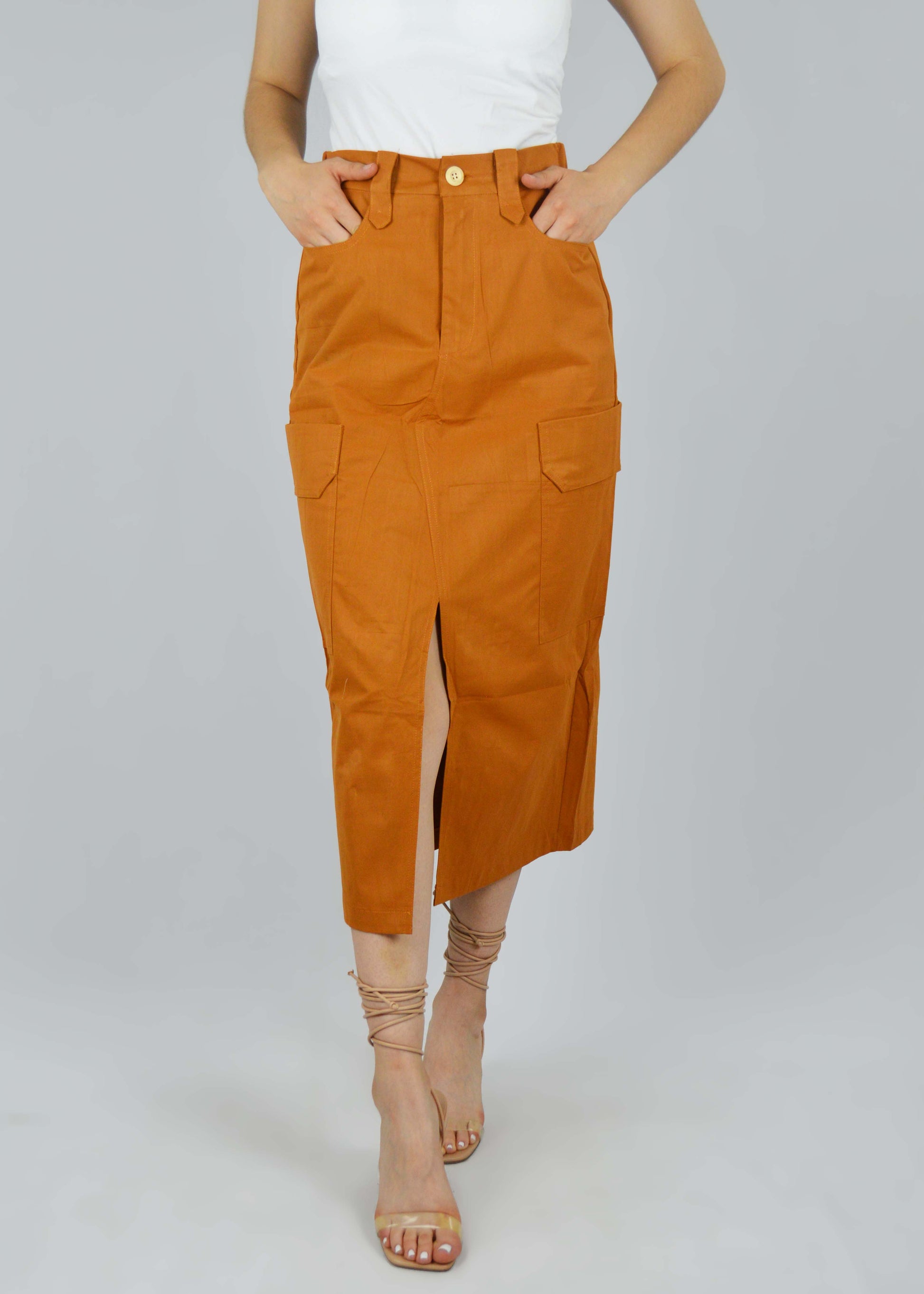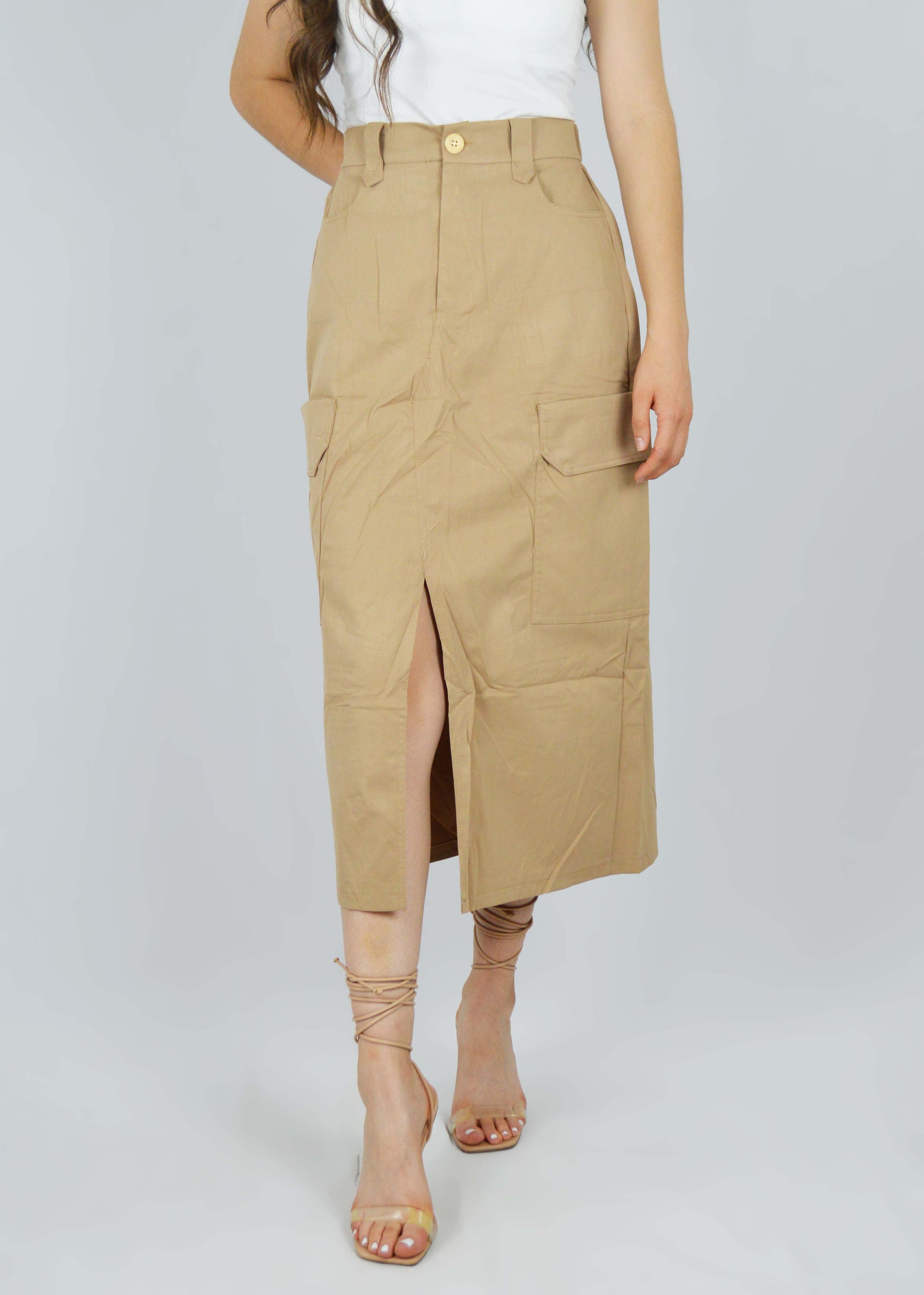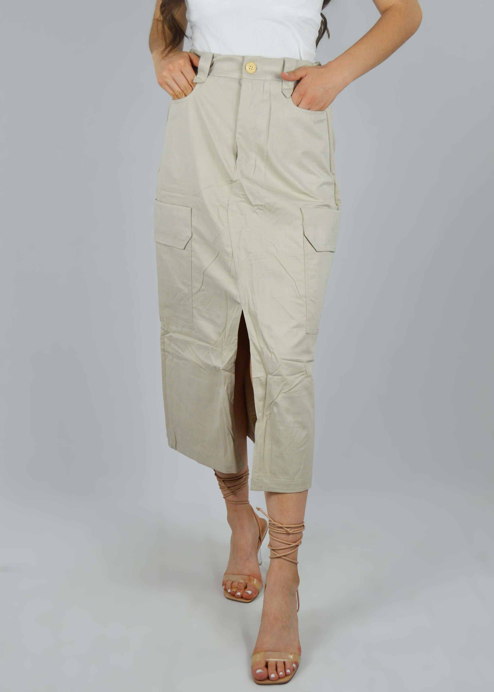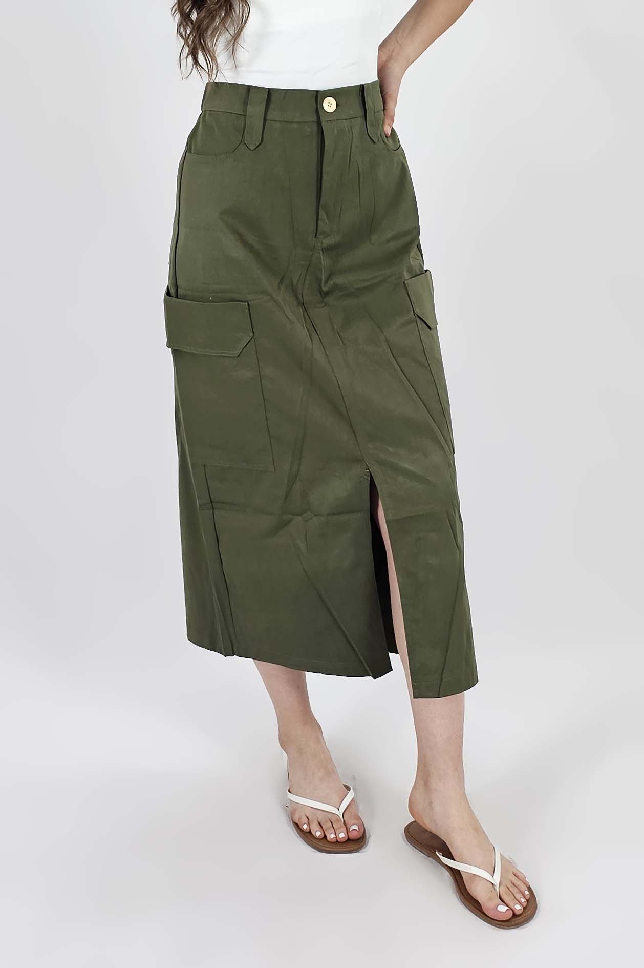 La falda larga cargo es una prenda versátil y funcional gracias a su estilo de estilo militar. Hecha de tela resistente, cuenta con varios bolsillos para llevar tus objetos básicos de manera práctica y segura. Añade un toque de moda y comodidad a tu atuendo con esta falda.